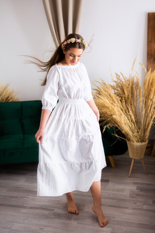 -         Dlhé ľanové šaty s trojštvrťovým rukávom ukončeným gumičkou